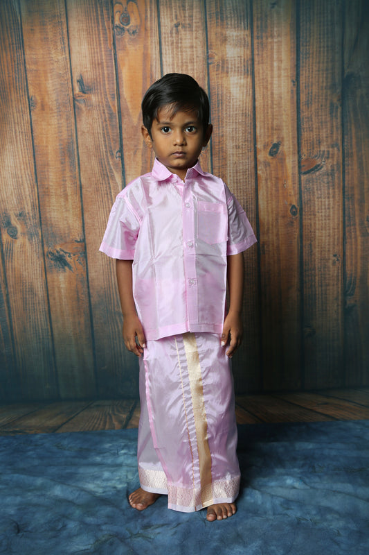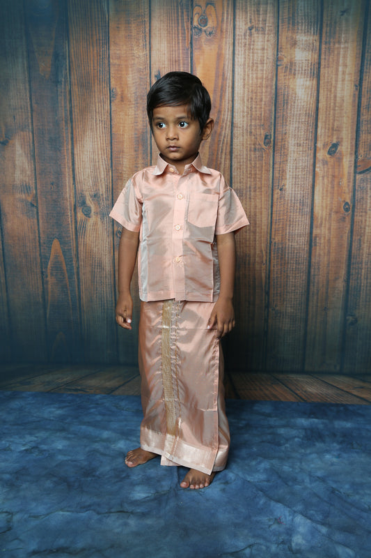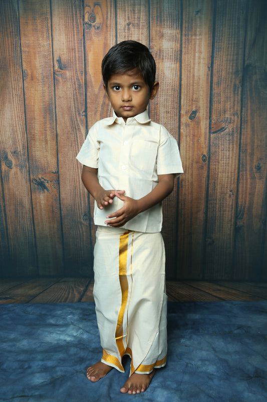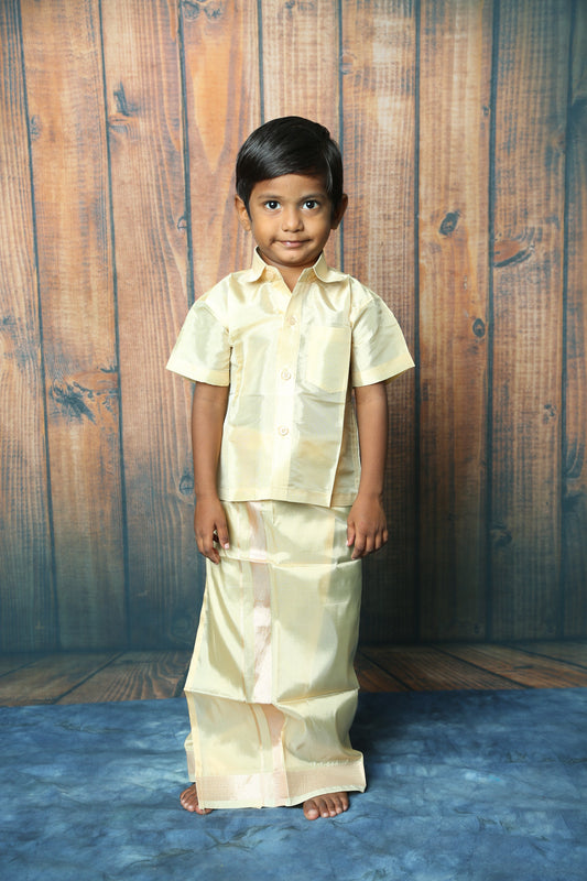 Boys Tissue Jari Half Sleeve Shirt Dhoti Set-Gold(Ready To Dispatch)