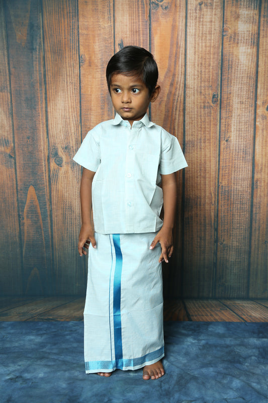 Boys Tissue Jari Half Sleeve Shirt Dhoti Set-Blue(Ready To Dispatch)